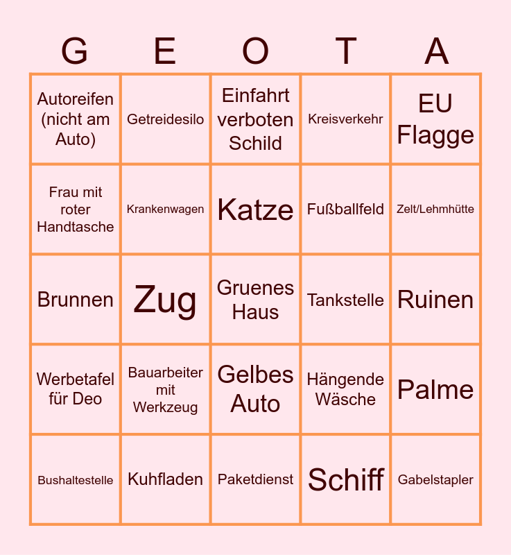 This bingo card has 86 words: Free!, Waschmaschine, Gelbes Auto, Rennende Frau, Stadtbus, Kaktus, Tunnel, Graffiti (nicht Schmiererei), Google Auto (Spiegelung), Bahnübergang, Kuh, Traktor, Palme, Ruinen, Denkmal/Statue, Katze, Burgerladen, Bauer mit Werkzeug, Friedhof, Wildes Tier (Kein Vogel), Ozean, Geldautomat, Brunnen, 5+ Fahrradfahrer, Schiff, Brücke, Hund, Briefkasten, Hydrant, Tempel/Kirche, Kuhfladen, Kran, Baufahrzeug, Bauarbeiter mit Werkzeug, Frau mit roter Handtasche, Dönerladen, Zelt/Lehmhütte, Polizeiauto, Feuerwehrauto, Zug, Garage, MC Donalds, Schnee (nicht Berg), Tankstelle, Straßenbahn, EU Flagge, Weißes Dach, Getreidesilo, Windrad, Schule, LKW mit Tank, Balkonblumen, Werbetafel für Deo, Abfalltonnen, Baugerüst, Rotes Motorrad, Wellblech Haus, Fußballfeld, Kreisverkehr, Krankenwagen, Autoreifen (nicht am Auto), eingeschlagene Fensterscheibe, Grill, Teich, toter Baum, Einfahrt verboten Schild, Park, Gruenes Haus, Gabelstapler, Tankstelle, Klimaanlage, Mensch mit Handy in der Hand, Bushaltestelle, Einkaufswagen, Spielplatz, Vogelhäusschen, Paketdienst, Zebrastreifen, Hochsitz, Taxi, Autohändler, Vogel, Schrein, Basketballplatz, Hängende Wäsche and Wasserturm.