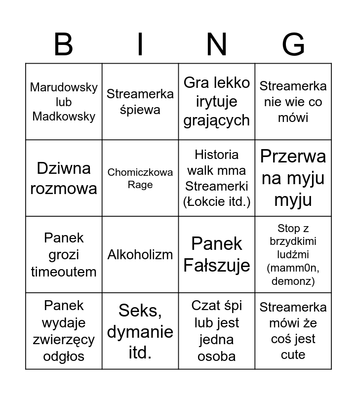 This bingo card has 16 words: Seks, dymanie itd., Stop z brzydkimi ludźmi (mamm0n, demonz), Gra lekko irytuje grających, Marudowsky lub Madkowsky, Panek grozi timeoutem, Streamerka śpiewa, Panek Fałszuje, Czat śpi lub jest jedna osoba, Dziwna rozmowa, Chomiczkowa Rage, Panek wydaje zwierzęcy odgłos, Streamerka nie wie co mówi, Alkoholizm, Przerwa na myju myju, Historia walk mma Streamerki (Łokcie itd.) and Streamerka mówi że coś jest cute.