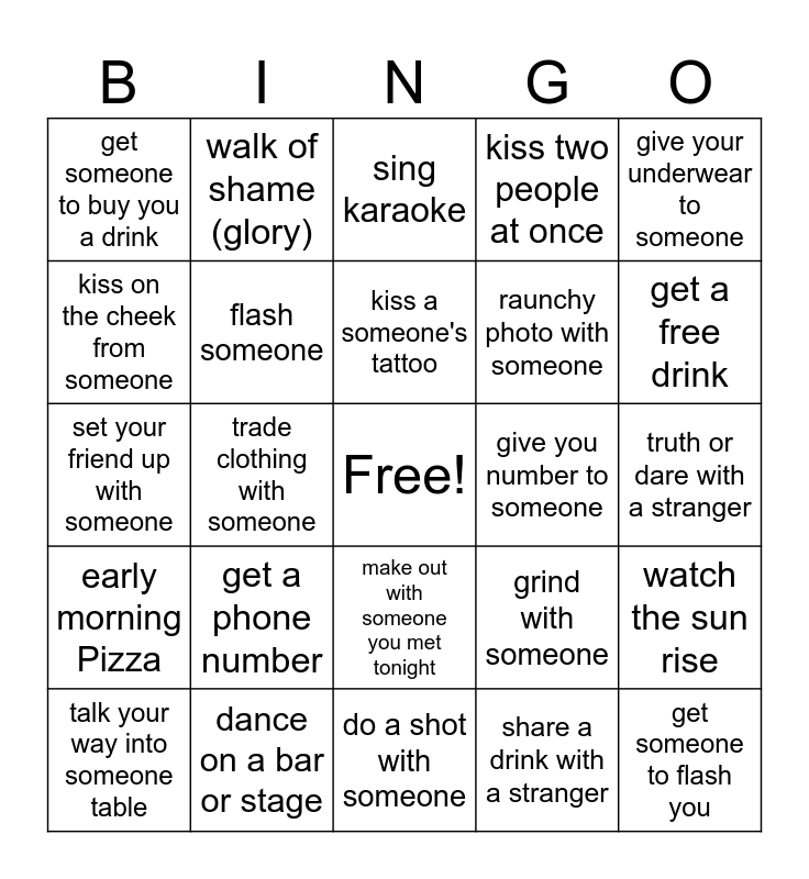 This bingo card has a free space and 24 words: get a phone number, dance on a bar or stage, kiss a someone's tattoo, talk your way into someone table, give your underwear to someone, get someone to buy you a drink, kiss on the cheek from someone, walk of shame (glory), give you number to someone, make out with someone you met tonight, raunchy photo with someone, set your friend up with someone, grind with someone, watch the sun rise, flash someone, share a drink with a stranger, truth or dare with a stranger, sing karaoke, get a free drink, trade clothing with someone, get someone to flash you, early morning Pizza, kiss two people at once and do a shot with someone.
