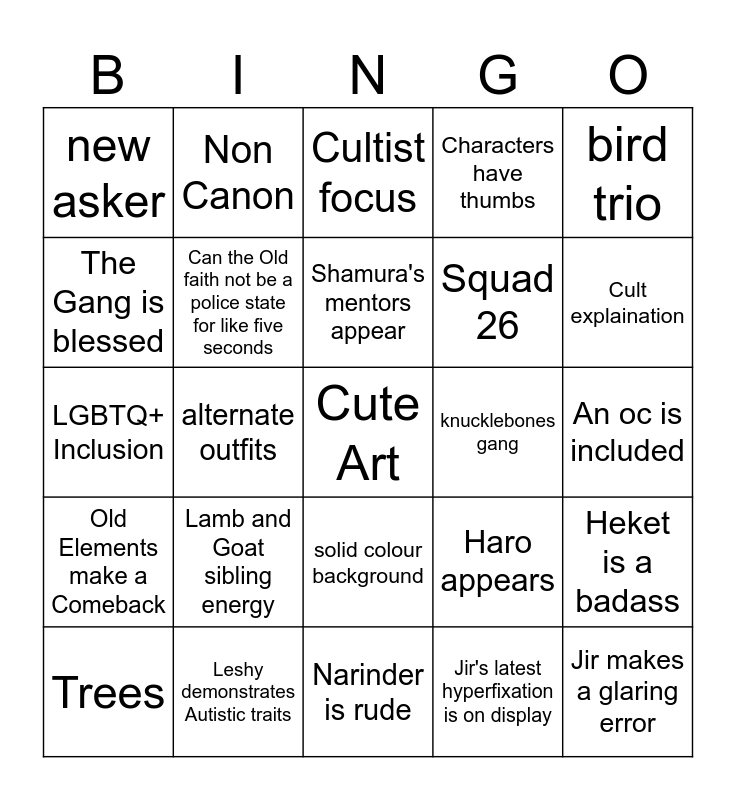 This bingo card has a free space and 100 words: Kallamar gets bullied, Vessels make an appearance, An oc is included, Madoka reference, reaction image, Angels/the Celestial Realm, Narilamb, Teem loses his sanity/Codes, Tragedy Occurs, Young Bishops, Looooooore, Elon suffers, New Character, Leshy demonstrates Autistic traits, Witness appearance, Aym and Baal show up, Squad 26, Jir uses the lineless style, Realization of a Wip Jir shared, the seller is unhelpful, The silly level hits 10, Deucey is given a new crown reaction, murder, Flower language, crimes, knucklebones gang, bird trio, Haro appears, the computer exists, 4th wall break, alternate outfits, new asker, art style switch, continuation of previous ask, Jir's latest hyperfixation is on display, Shamura's mentors appear, Heket is a badass, Leshy eats something/is implied to, The Lamb shows up, Goat Post, Jir takes artistic liberties on a canon event, Fandom reference, LGBTQ+ Inclusion, Past bearers, Cult explaination, Cultist focus, Non-Cotl media, Swap au, Vessel Families, Narinder is rude, minor cotl character gets a glow up, Sybil!!!, Lamb is depressed, The Jir art goes hard, Jir Gore™, Kallamar's a terrible brother, Shamura's depressed, Niche worldbuilding point, Food/Drink, Characters have thumbs, Jir makes the gang emotional, Omg Felix hiiiii, The Goat crushes/dotes on Narinder, The seller is actually helpful, Jir reuses a panel in a meaningful way, Audience participation, Pilgrim DLC, Geep, Ratdad, Shamura has immense disdain for the asker, Rilala content, Lamb and Goat sibling energy, Magic Use, Post Game, Injured Bishops, Insert old post idea with new characters, Family members are dead, The Gang is blessed, Shocking revealation, Sick visual, Anachronism, Jir makes a glaring error, Full body character, solid colour background, Chickpea is just trying to work, Non Canon, Bad Parenting, Special Event, Miscellaneous NPCs, Old Elements make a Comeback, Chess Imagery, flat affect comedy, The fox is a wholeass menace, Trees, Can the Old faith not be a police state for like five seconds, Book worm, Bishop/Lamb Temple, Dolls, parallel worlds and emotion bubbles.