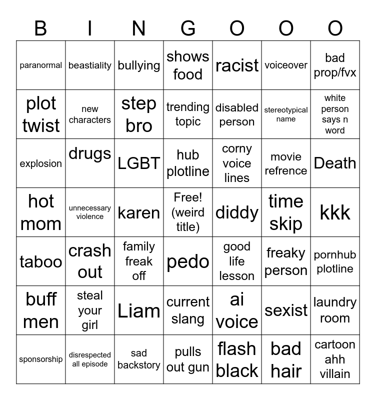 This bingo card has a free space and 48 words: ai voice, stereotypical name, pulls out gun, unnecessary violence, LGBT, kkk, beastiality, disrespected all episode, voiceover, pedo, bad prop/fvx, shows food, movie refrence, corny voice lines, buff men, time skip, plot twist, white person says n word, sexist, racist, disabled person, karen, paranormal, new characters, laundry room, step bro, Death, sponsorship, hub plotline, drugs, bad hair, diddy, pornhub plotline, steal your girl, hot mom, good life lesson, freaky person, explosion, family freak off, Liam, taboo, cartoon ahh villain, bullying, sad backstory, trending topic, current slang, crash out and flash black.
