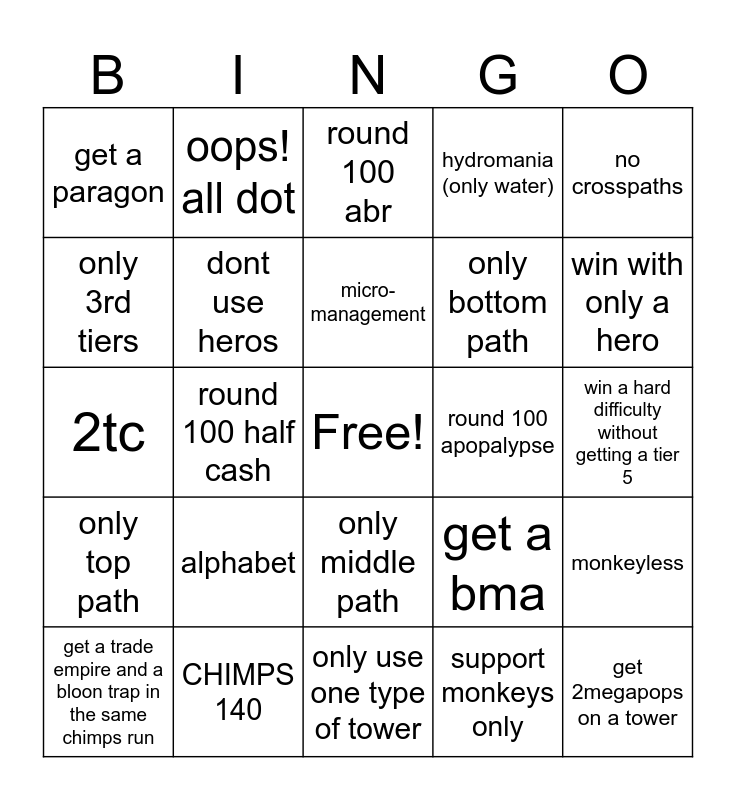 This bingo card has a free space and 24 words: alphabet, CHIMPS 140, micro-management, get a trade empire and a bloon trap in the same chimps run, no crosspaths, get a paragon, only 3rd tiers, oops! all dot, round 100 apopalypse, only middle path, only bottom path, 2tc, get a bma, monkeyless, dont use heros, support monkeys only, win a hard difficulty without getting a tier 5, round 100 abr, win with only a hero, round 100 half cash, get 2megapops on a tower, only top path, hydromania (only water) and only use one type of tower.