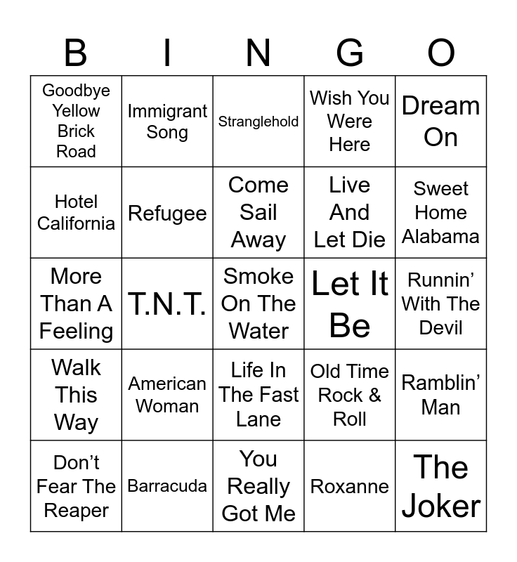 This bingo card has a free space and 24 words: American Woman, Barracuda, Come Sail Away, Don’t Fear The Reaper, Dream On, Goodbye Yellow Brick Road, Hotel California, Immigrant Song, Let It Be, Life In The Fast Lane, Live And Let Die, More Than A Feeling, Old Time Rock & Roll, Ramblin’ Man, Refugee, Roxanne, Runnin’ With The Devil, Stranglehold, Sweet Home Alabama, T.N.T., The Joker, Walk This Way, Wish You Were Here and You Really Got Me.