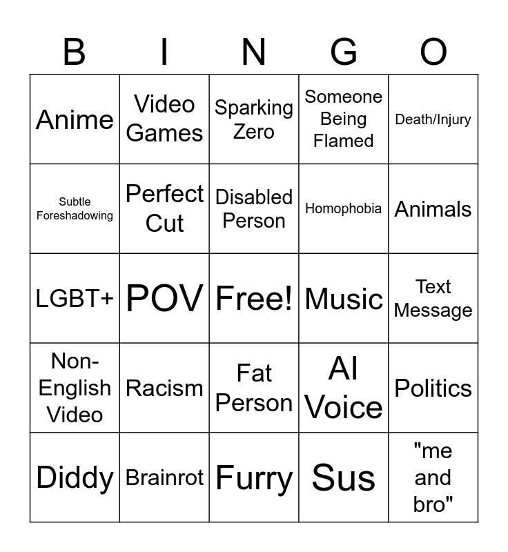 This bingo card has a free space and 24 words: Racism, Brainrot, Disabled Person, Diddy, Death/Injury, Anime, Subtle Foreshadowing, Video Games, Music, Fat Person, Homophobia, LGBT+, AI Voice, Politics, Perfect Cut, Sus, Text Message, Sparking Zero, Animals, POV, "me and bro", Non-English Video, Someone Being Flamed and Furry.