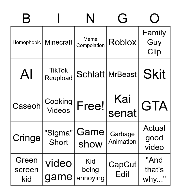 This bingo card has a free space and 24 words: "Sigma" Short, video game, Schlatt, Green screen kid, Family Guy Clip, Homophobic, AI, Minecraft, Kai senat, Game show, MrBeast, Caseoh, Garbage Animation, Actual good video, TikTok Reupload, CapCut Edit, GTA, Meme Compolation, Skit, Cooking Videos, "And that's why...", Cringe, Roblox and Kid being annoying.