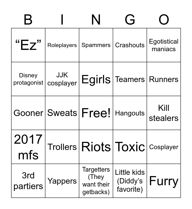 This bingo card has a free space and 24 words: Trollers, Yappers, Egirls, 3rd partiers, Egotistical maniacs, “Ez”, Disney protagonist, Roleplayers, Hangouts, Riots, Teamers, Gooner, Toxic, Cosplayer, JJK cosplayer, Little kids (Diddy’s favorite), Kill stealers, Spammers, Runners, Sweats, Furry, 2017 mfs, Crashouts and Targetters (They want their getbacks).