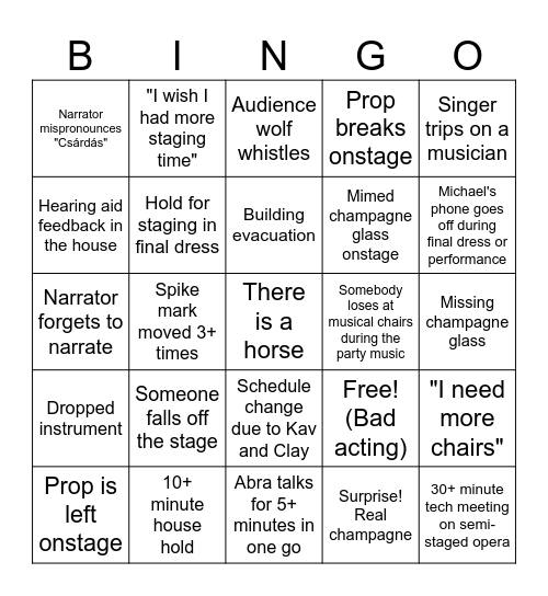 This bingo card has 25 words: Someone falls off the stage, Abra talks for 5+ minutes in one go, Building evacuation, Prop is left onstage, Singer trips on a musician, Narrator mispronounces "Csárdás", Hearing aid feedback in the house, "I wish I had more staging time", Somebody loses at musical chairs during the party music, Schedule change due to Kav and Clay, Mimed champagne glass onstage, Narrator forgets to narrate, Free! (Bad acting), "I need more chairs", Hold for staging in final dress, 30+ minute tech meeting on semi-staged opera, Missing champagne glass, Audience wolf whistles, Michael's phone goes off during final dress or performance, Spike mark moved 3+ times, There is a horse, 10+ minute house hold, Dropped instrument, Prop breaks onstage and Surprise! Real champagne.