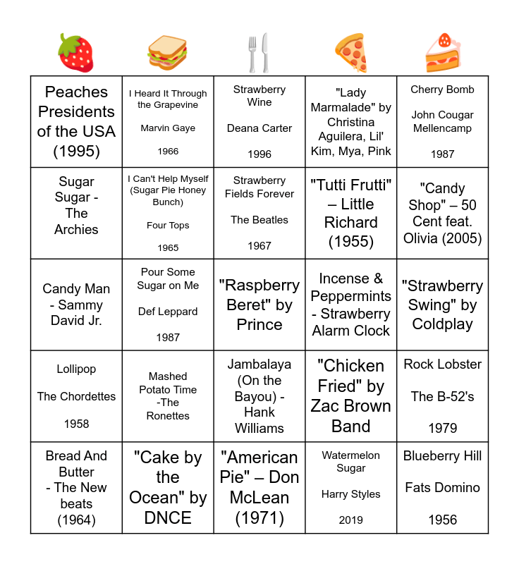 This bingo card has 32 words: Watermelon Sugar Harry Styles 2019, (Put the Lime in the) Coconut Harry Nilsson 1972, Pour Some Sugar on Me Def Leppard 1987, I've Got a Lovely Bunch of Coconuts Danny Kaye 1951, Lollipop The Chordettes 1958, I Can't Help Myself (Sugar Pie Honey Bunch) Four Tops 1965, Cherry Bomb John Cougar Mellencamp 1987, Rock Lobster The B-52's 1979, I Heard It Through the Grapevine Marvin Gaye 1966, Blueberry Hill Fats Domino 1956, Strawberry Fields Forever The Beatles 1967, Strawberry Wine Deana Carter 1996, Cherry Pie Warrant 1990, Brown Sugar The Rolling Stones 1971, Incense & Peppermints - Strawberry Alarm Clock, I want Candy - Bow Wow Wow, Bread And Butter - The New beats (1964), Candy Man - Sammy David Jr., Jambalaya (On the Bayou) -Hank Williams, Mashed Potato Time -The Ronettes, "Chicken Fried" by Zac Brown Band, "Cheeseburger in Paradise" by Jimmy Buffett, "Strawberry Swing" by Coldplay, "Cake by the Ocean" by DNCE, "Raspberry Beret" by Prince, "Lady Marmalade" by Christina Aguilera, Lil' Kim, Mya, Pink, "Tutti Frutti" – Little Richard (1955), Sugar Sugar - The Archies, Peaches Presidents of the USA (1995), "American Pie" – Don McLean (1971), "Candy Girl" – New Edition (1983) and "Candy Shop" – 50 Cent feat. Olivia (2005).