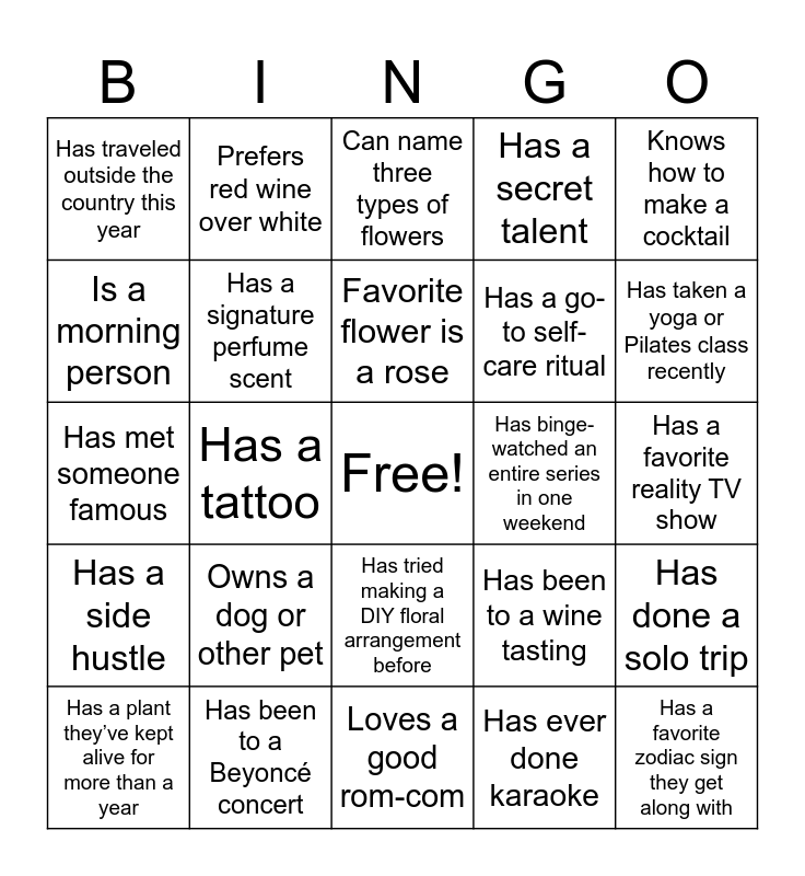 This bingo card has a free space and 24 words: Owns a dog or other pet, Has been to a Beyoncé concert, Favorite flower is a rose, Has a plant they’ve kept alive for more than a year, Knows how to make a cocktail, Has traveled outside the country this year, Is a morning person, Prefers red wine over white, Has binge-watched an entire series in one weekend, Has tried making a DIY floral arrangement before, Has a go-to self-care ritual, Has met someone famous, Has been to a wine tasting, Has done a solo trip, Has a signature perfume scent, Has ever done karaoke, Has a favorite reality TV show, Can name three types of flowers, Has taken a yoga or Pilates class recently, Has a tattoo, Has a favorite zodiac sign they get along with, Has a side hustle, Has a secret talent and Loves a good rom-com.