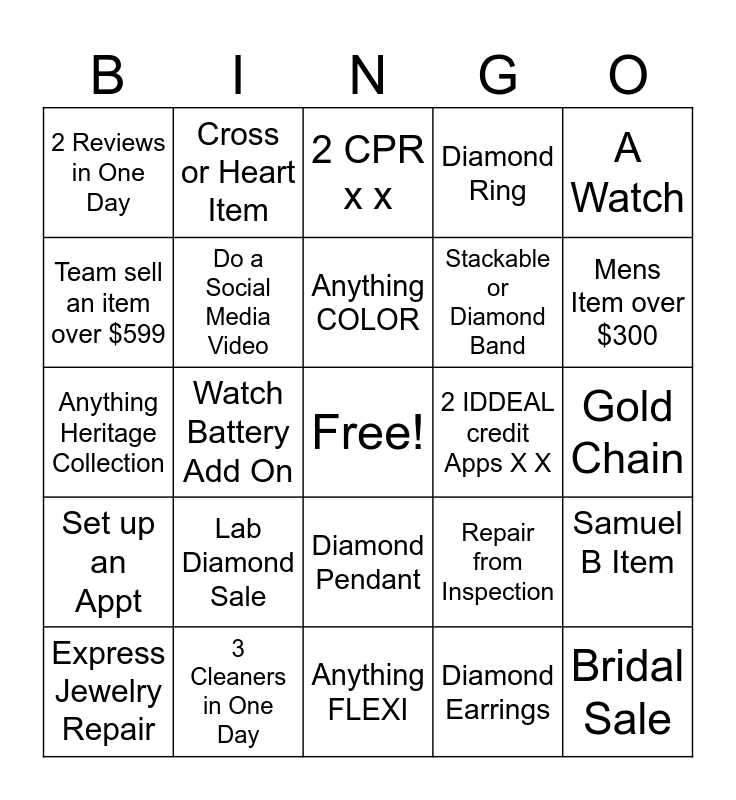This bingo card has a free space and 24 words: Lab Diamond Sale, 3 Cleaners in One Day, Anything COLOR, Express Jewelry Repair, A Watch, 2 Reviews in One Day, Team sell an item over $599, Cross or Heart Item, 2 IDDEAL credit Apps X X, Diamond Pendant, Stackable or Diamond Band, Anything Heritage Collection, Repair from Inspection, Samuel B Item, Do a Social Media Video, Diamond Earrings, Gold Chain, 2 CPR x x, Mens Item over $300, Watch Battery Add On, Bridal Sale, Set up an Appt, Diamond Ring and Anything FLEXI.