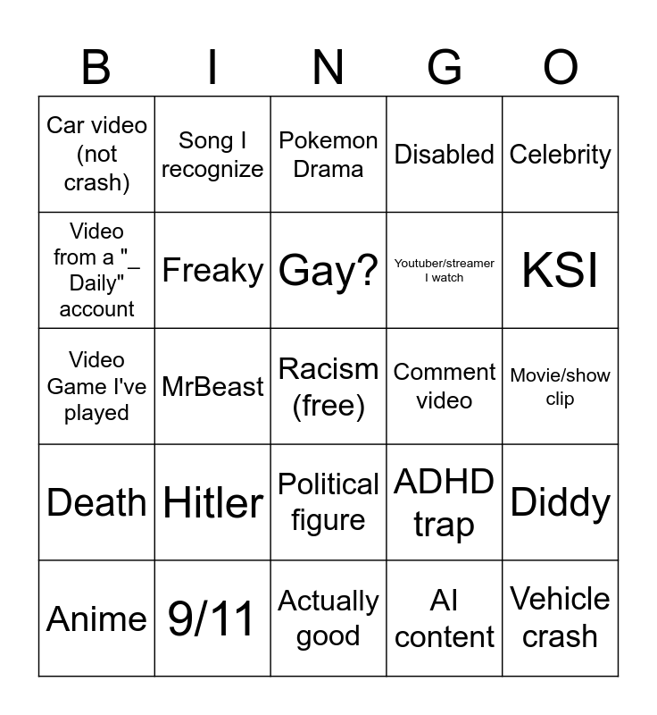 This bingo card has a free space and 24 words: Hitler, 9/11, Gay?, Anime, Celebrity, Car video (not crash), Video from a "_ Daily" account, Song I recognize, Comment video, Political figure, Youtuber/streamer I watch, Video Game I've played, ADHD trap, Diddy, Freaky, AI content, Movie/show clip, Pokemon Drama, KSI, MrBeast, Vehicle crash, Death, Disabled and Actually good.