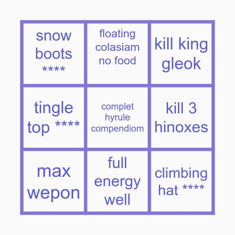 This bingo card has a free space and 8 words: kill 3 hinoxes, kill king gleok, floating colasiam no food, max wepon, snow boots ****, climbing hat ****, tingle top **** and full energy well.