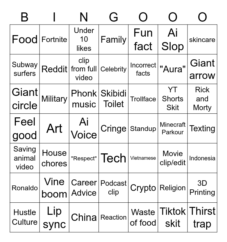 This bingo card has a free space and 62 words: Bad remix of a song, Feel good, Dropship, Military, Thirst trap, 3D Printing, skincare, Sports, Reddit, Hustle Culture, Family, Podcast clip, Ai Slop, Standup, Pov, Food, "Aura", Fun fact, Science, Subway surfers, Giant arrow, Under 10 likes, Rick and Morty, Ai Voice, Food, Vietnamese, House chores, Pranks, YT Shorts Skit, Indonesia, Life hack, Career Advice, Tiktok skit, Biker, Giant circle, Fortnite, Crypto, Movie clip/edit, Incorrect facts, Minecraft Parkour, Celebrity, Religion, Phonk music, Thai, clip from full video, Trollface, "Respect", Lip sync, Reaction, Waste of food, Skibidi Toilet, Art, Intended for toddlers, Vine boom, Meme compilation, Texting, Tech, Ronaldo, China, Cute animal video, Saving animal video and Boomer comment section.