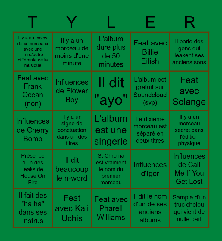 This bingo card has a free space and 24 words: Il fait des "ha ha" dans ses instrus, Il dit beaucoup le n-word, Il dit "ayo", Il dit le nom d'un de ses anciens albums, Il parle des gens qui leakent ses anciens sons, Il y a au moins deux morceaux avec une intro/outro différente de la musique, Il y a un morceau de moins d'une minute, L'album dure plus de 50 minutes, Le dixième morceau est séparé en deux titres, Il y a un morceau secret dans l'édition physique, Influences de Cherry Bomb, Influences de Flower Boy, Influences d'Igor, Influences de Call Me If You Get Lost, Feat avec Frank Ocean (non), Feat avec Kali Uchis, Feat avec Pharell Williams, Feat avec Billie Eilish, Feat avec Solange, Présence d'un des leaks de House On Fire, Il y a un signe de ponctuation dans un des titres, St Chroma est vraiment le nom du premier morceau, L'album est gratuit sur Soundcloud (svp) and Sample d'un truc chelou qui vient de nulle part.