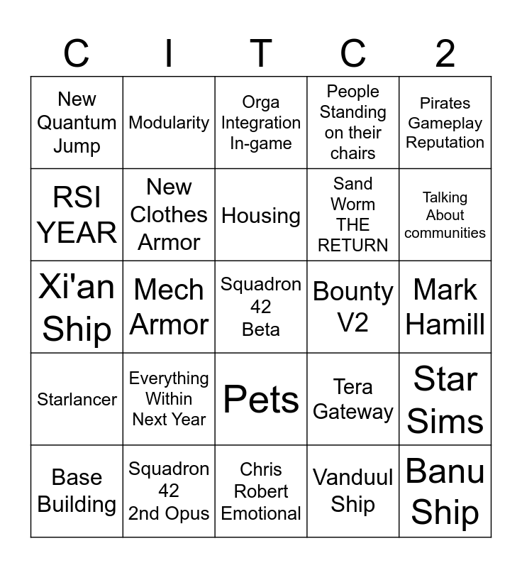 This bingo card has a free space and 24 words: Everything Within Next Year, Squadron 42 2nd Opus, Housing, Base Building, Pirates Gameplay Reputation, New Quantum Jump, RSI YEAR, Modularity, Bounty V2, Pets, Sand Worm THE RETURN, Xi'an Ship, Tera Gateway, Star Sims, New Clothes Armor, Vanduul Ship, Mark Hamill, Orga Integration In-game, Talking About communities, Mech Armor, Banu Ship, Starlancer, People Standing on their chairs and Chris Robert Emotional.