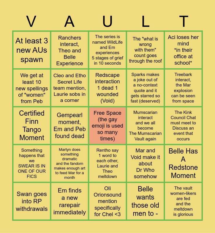 This bingo card has a free space and 24 words: Martyn does something dramatic and the fandom makes enough art to feed Mar for a month, Em finds a new rarepair immediately, Redscape interaction 1 dead 1 wounded (Void), Swan goes into RP withdrawals, Aci loses her mind *in their office at school*, At least 3 new AUs spawn, We get at least 10 new spellings of "women" from Peb, Ranchers interact, Theo and Belle Experience, Mumscarian interact and we all become The Mumscarian Vault again, Rentho say 1 word to each other, Laurie and Theo meltdown, Sparks makes a joke out of a no-context quote and it gets starred so fast (deserved), Certified Finn Tango Moment, Mar and Void make it about Dr Who somehow, Belle Has A Redstone Moment, Cleo and Etho Secret Life team mention, Laurie sobs in a corner, Belle wants those old men to -, The Kink Council Chat must meet to Discuss an event that occurs, The series is named WildLife and Em experiences 5 stages of grief in 10 seconds, Treebark interact, the Mar explosion can be seen from space, Gempearl moment, Em and Peb found dead, The vault women-likers are fed and the meltdown is glorious, Something happens that we SWEAR IS IN ONE OF OUR FICS, The "what is wrong with them" count goes through the roof and Oli Orionsound mention specifically for Chel <3.