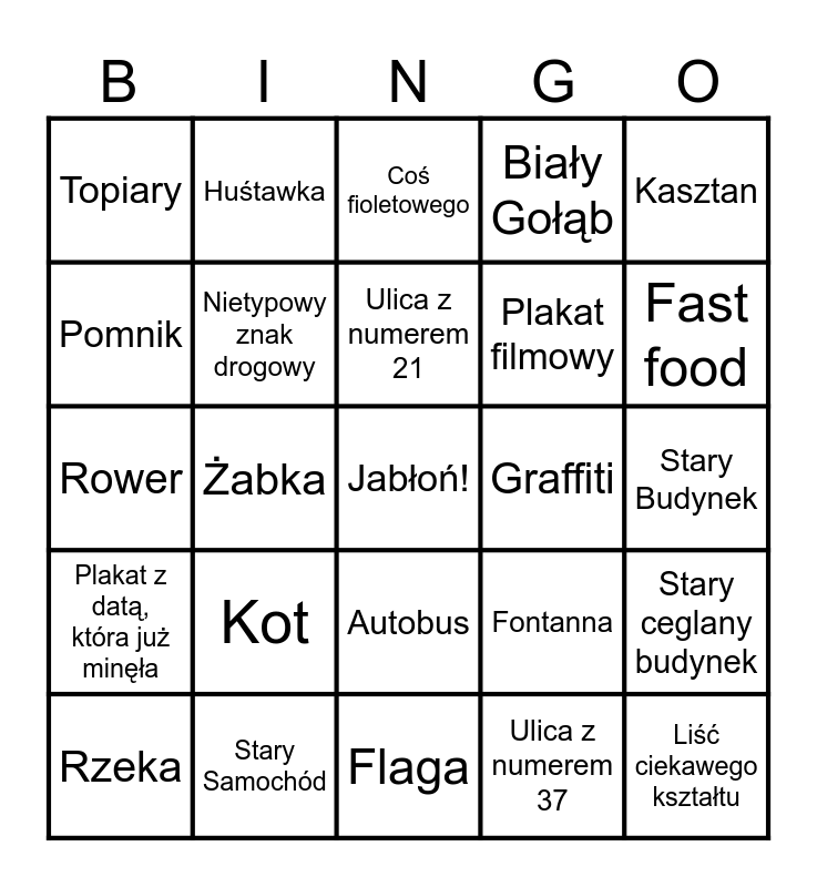 This bingo card has a free space and 24 words: Kot, Stary Samochód, Ulica z numerem 21, Rzeka, Kasztan, Topiary, Pomnik, Huśtawka, Graffiti, Autobus, Plakat filmowy, Rower, Fontanna, Stary ceglany budynek, Nietypowy znak drogowy, Ulica z numerem 37, Stary Budynek, Coś fioletowego, Fast food, Żabka, Liść ciekawego kształtu, Plakat z datą, która już minęła, Biały Gołąb and Flaga.