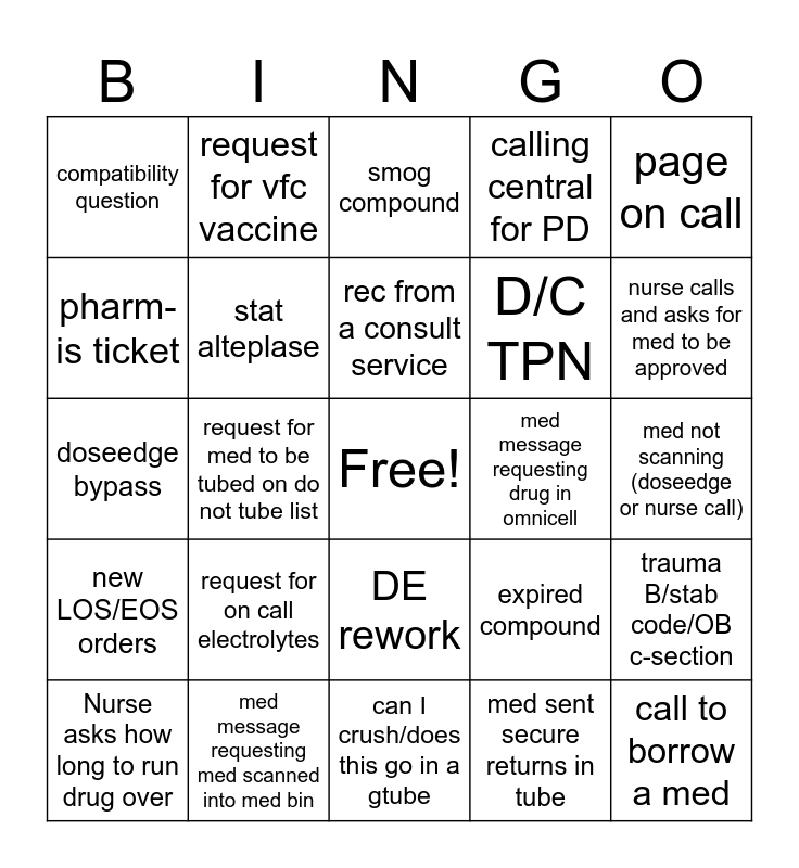 This bingo card has a free space and 55 words: survanta, Nurse asks how long to run drug over, Receive strange item in the tube, compatibility question, can I crush/does this go in a gtube, TPN issue, stat alteplase, temperature/pressure alarm, D/C TPN, IV hoarding stats, calling central for PD, code response needed, picu missing med, med request for order put in <10 min ago, need med from central or nurse requesting item that comes from central, tube station down, page on call, request for med to be tubed on do not tube list, retail (break-in, counseling, nurse calling wrong #), call to borrow a med, med message requesting drug in omnicell, need new tackle box, expired compound, smog compound, page or call NNP, rec from a consult service, med sent secure returns in tube, omnicell discrepancy, med not scanning (doseedge or nurse call), trauma B/stab code/OB c-section, expired med (not compound), call from OR, new DKA needs bags STAT, calling maintenance or environmental services, pharm-is ticket, doseedge bypass, brand new TPN, new LOS/EOS orders, call from outside pharm to borrow med, tube shut down for full tube, request for vfc vaccine, recon antibiotic, ID home med, status board clear, request for on call electrolytes, med message requesting med scanned into med bin, phone call from MD needing dose recommendation, critical dose warning override, need to make dilution narc, nurse calls and asks for med to be approved, epic queue clear, Door bell to pharmacy, IV room calls out for stock, DE rework and need to waste for a narc.