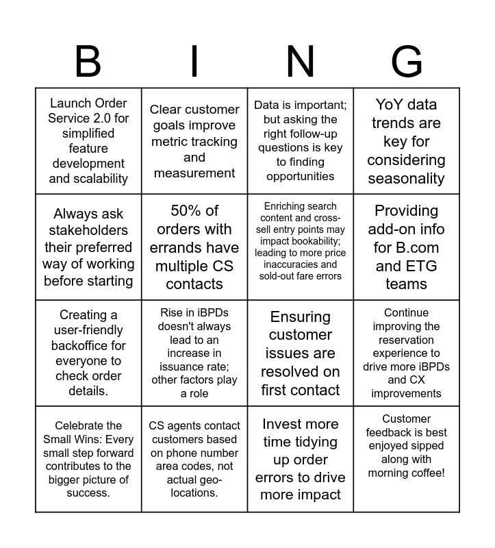 This bingo card has 16 words: CS agents contact customers based on phone number area codes, not actual geo-locations., Continue improving the reservation experience to drive more iBPDs and CX improvements, Data is important; but asking the right follow-up questions is key to finding opportunities, Launch Order Service 2.0 for simplified feature development and scalability, Creating a user-friendly backoffice for everyone to check order details., Clear customer goals improve metric tracking and measurement, Ensuring customer issues are resolved on first contact, Invest more time tidying up order errors to drive more impact, Always ask stakeholders their preferred way of working before starting, 50% of orders with errands have multiple CS contacts, Celebrate the Small Wins: Every small step forward contributes to the bigger picture of success., YoY data trends are key for considering seasonality, Rise in iBPDs doesn't always lead to an increase in issuance rate; other factors play a role, Providing add-on info for B.com and ETG teams, Enriching search content and cross-sell entry points may impact bookability; leading to more price inaccuracies and sold-out fare errors and Customer feedback is best enjoyed sipped along with morning coffee!.