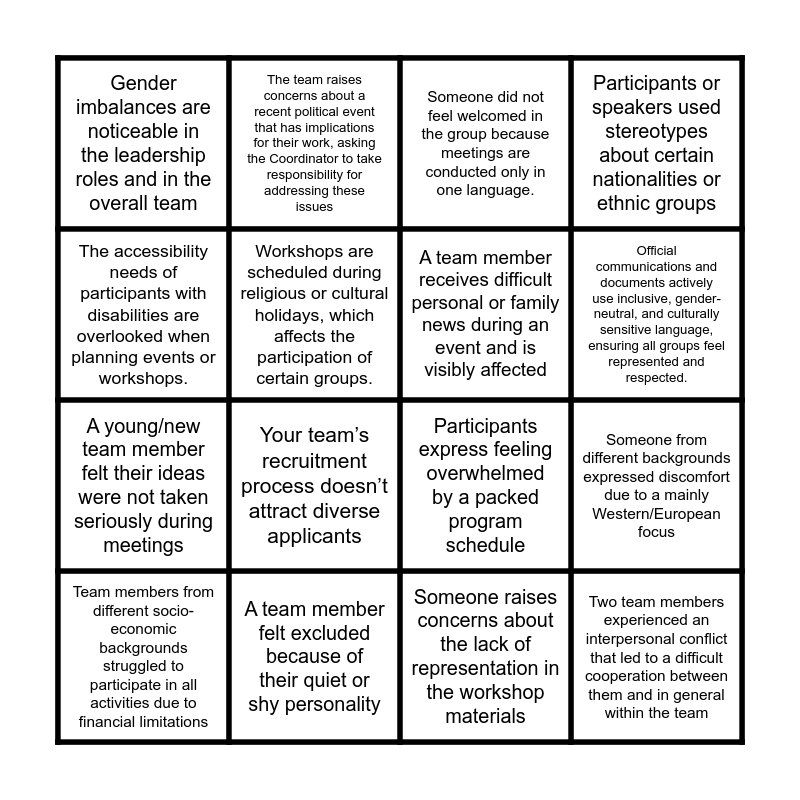 This bingo card has 16 words: A team member felt excluded because of their quiet or shy personality, Someone from different backgrounds expressed discomfort due to a mainly Western/European focus, Someone did not feel welcomed in the group because meetings are conducted only in one language., Gender imbalances are noticeable in the leadership roles and in the overall team, A young/new team member felt their ideas were not taken seriously during meetings, The team raises concerns about a recent political event that has implications for their work, asking the Coordinator to take responsibility for addressing these issues, Participants express feeling overwhelmed by a packed program schedule, Someone raises concerns about the lack of representation in the workshop materials, The accessibility needs of participants with disabilities are overlooked when planning events or workshops., Workshops are scheduled during religious or cultural holidays, which affects the participation of certain groups., Team members from different socio-economic backgrounds struggled to participate in all activities due to financial limitations, Participants or speakers used stereotypes about certain nationalities or ethnic groups, Your team’s recruitment process doesn’t attract diverse applicants, Official communications and documents actively use inclusive, gender-neutral, and culturally sensitive language, ensuring all groups feel represented and respected., A team member receives difficult personal or family news during an event and is visibly affected and Two team members experienced an interpersonal conflict that led to a difficult cooperation between them and in general within the team.