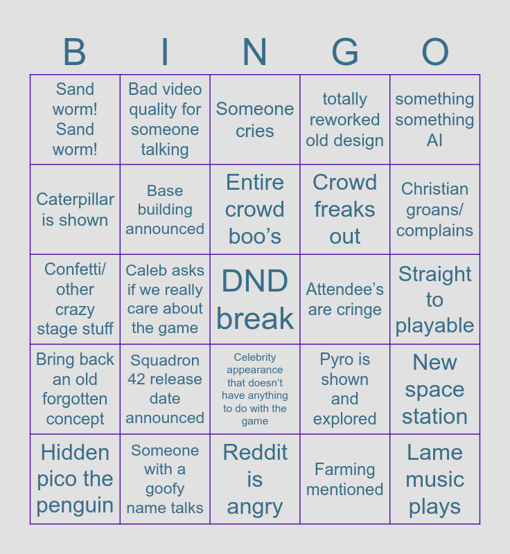This bingo card has a free space and 24 words: Squadron 42 release date announced, Someone with a goofy name talks, Entire crowd boo’s, Hidden pico the penguin, something something AI, Sand worm! Sand worm!, Caterpillar is shown, Bad video quality for someone talking, Attendee’s are cringe, Celebrity appearance that doesn’t have anything to do with the game, Crowd freaks out, Confetti/ other crazy stage stuff, Pyro is shown and explored, New space station, Base building announced, Farming mentioned, Straight to playable, Someone cries, Christian groans/ complains, Caleb asks if we really care about the game, Lame music plays, Bring back an old forgotten concept, totally reworked old design and Reddit is angry.