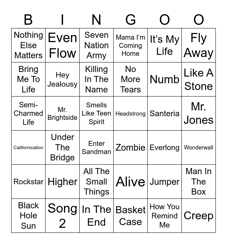 This bingo card has 36 words: Alive, All The Small Things, Basket Case, Bring Me To Life, Californication, Headstrong, Hey Jealousy, In The End, It’s My Life, Jumper, Like A Stone, Mama I’m Coming Home, Man In The Box, Mr. Brightside, No More Tears, Nothing Else Matters, Rockstar, Santeria, Semi-Charmed Life, Seven Nation Army, Smells Like Teen Spirit, Under The Bridge, Zombie, Enter Sandman, Everlong, Even Flow, Numb, Song 2, Killing In The Name, Fly Away, Creep, Black Hole Sun, Wonderwall, Mr. Jones, Higher and How You Remind Me.