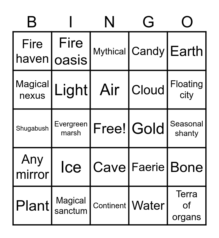 This bingo card has a free space and 24 words: Plant, Ice, Air, Water, Earth, Fire haven, Fire oasis, Mythical, Gold, Seasonal shanty, Shugabush, Light, Faerie, Bone, Magical nexus, Magical sanctum, Continent, Candy, Floating city, Any mirror, Evergreen marsh, Cave, Cloud and Terra of organs.