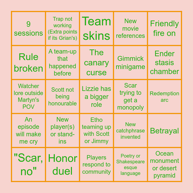 This bingo card has 25 words: New player(s) or stand-ins, Players respond to community, The canary curse, "Scar, no", Friendly fire on, 9 sessions, Rule broken, Trap not working (Extra points if its Grian's), Scar trying to get a monopoly, Etho teaming up with Scott or Jimmy, Gimmick minigame, Watcher lore outside Martyn's POV, New catchphrase invented, Betrayal, A team-up that happened before, Ocean monument or desert pyramid, Redemption arc, Team skins, Ender stasis chamber, Scott not being honourable, Lizzie has a bigger role, Honor duel, An episode will make me cry, New movie references and Poetry or Shakespeare esque language.
