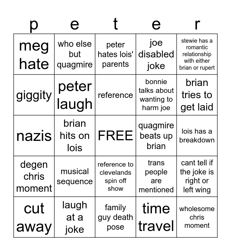 This bingo card has a free space and 24 words: musical sequence, laugh at a joke, reference, cut away, stewie has a romantic relationship with either brian or rupert, meg hate, giggity, who else but quagmire, quagmire beats up brian, reference to clevelands spin off show, bonnie talks about wanting to harm joe, nazis, trans people are mentioned, cant tell if the joke is right or left wing, peter laugh, time travel, lois has a breakdown, peter hates lois' parents, brian tries to get laid, brian hits on lois, wholesome chris moment, degen chris moment, joe disabled joke and family guy death pose.