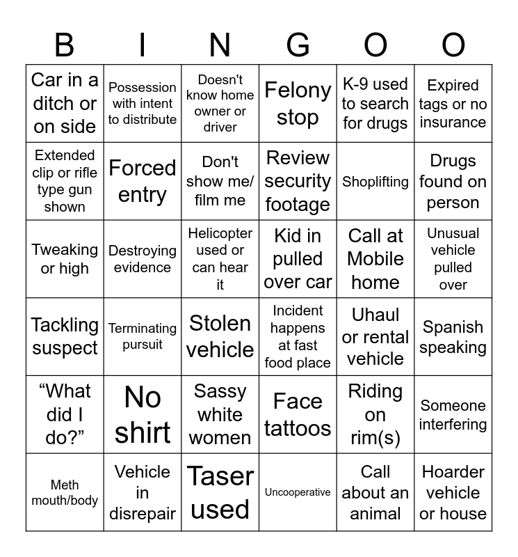 This bingo card has 101 words: Free to go, K-9 called to search for suspect, K-9 used to search for drugs, Edibles/weed found, Multiple items on hood, Open container, Pouring out alcohol, Non cop wearing camouflage, Riding dirty, Domestic fight, Crying, Speeds over 100, Noise disturbance, No shirt, Pulled over bicycle, Call about an animal, Kid in pulled over car, Sobriety test, Warrant(s), DUI, 5 or more beeps, Needles/pipe/scale any paraphernalia, Gun found, Fire must see flames, On parole probation, Review security footage, Felony stop, Call at Mobile home, Call at motel, Incident happens at gas station, Possession with intent to distribute, Doesn't know home owner or driver, Suspended license, Driving in to on coming traffic, Vehicle in disrepair, Unusual vehicle pulled over, Hops out with out being told, Missing clothing, Spanish speaking, Uhaul or rental vehicle, Break in, Stolen vehicle, Home base, Someone interfering, Meth mouth/body, Tweaking or high, Talks self in to cuffs, Riding on rim(s), Walking a dog or holding a pet, “What did I do?”, Homeless person or camp, Expired tags or no insurance, Sassy white women, Sassy black person, Battery on an officer/ officer injured, Blood, Ambulance on scene, Firetruck on scene, Suspect screaming, Overdose, Extended clip or rifle type gun shown, Suspect under 21, “It wasn't me” or some variation, They just left, Hair dyed or cut unnaturally/ wig, Don't show me/ film me, Running from officers, Drugs found on person, Incident happens at fast food place, Disturbance happens in parking lot, Suspect dragged out of house or car, Face tattoos, Car in a ditch or on side, Person passed out, Forced entry, Shoplifting, Command given more then 10 times, Pulled over because of a light issue, Family dispute/ fight, Neighbor fight, Suspect on roof or in a tree or stuck, Pills, Destroying evidence, Throwing or hiding evidence, Taser used, Hoarder vehicle or house, Helicopter used or can hear it, Drunk person or drunk people, Some passed out, Trespassing or told not to come back or will be arrested, Tackling suspect, Uncooperative, Continues using phone, Refusing to obey lawful order, Responding to accident, Terminating pursuit, High speed chase, “It's not mine”, Lying to the officer, Know to the officers and Hosts or cop explains different places have different laws.