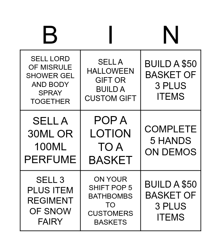 This bingo card has a free space and 8 words: COMPLETE 5 HANDS ON DEMOS, BUILD A $50 BASKET OF 3 PLUS ITEMS, SELL A HALLOWEEN GIFT OR BUILD A CUSTOM GIFT, SELL 3 PLUS ITEM REGIMENT OF SNOW FAIRY, SELL LORD OF MISRULE SHOWER GEL AND BODY SPRAY TOGETHER, BUILD A $50 BASKET OF 3 PLUS ITEMS, SELL A 30ML OR 100ML PERFUME and ON YOUR SHIFT POP 5 BATHBOMBS TO CUSTOMERS BASKETS.