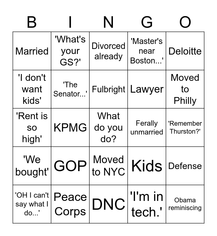 This bingo card has a free space and 24 words: GOP, Peace Corps, Fulbright, 'OH I can't say what I do...', Deloitte, Married, 'I don't want kids', 'What's your GS?', Ferally unmarried, Moved to NYC, Lawyer, 'Rent is so high', Kids, Defense, 'The Senator...', 'I'm in tech.', 'Remember Thurston?', Divorced already, Moved to Philly, KPMG, Obama reminiscing, 'We bought', 'Master's near Boston...' and DNC.