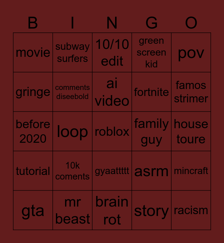 This bingo card has a free space and 24 words: gta, 10k coments, ai video, story, pov, movie, subway surfers, 10/10 edit, family guy, house toure, before 2020, comments diseebold, asrm, mincraft, gringe, mr beast, brain rot, green screen kid, famos strimer, tutorial, loop, gyaattttt, fortnite and racism.