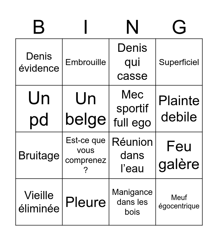 This bingo card has 16 words: Pleure, Feu galère, Denis qui casse, Denis évidence, Bruitage, Embrouille, Réunion dans l’eau, Manigance dans les bois, Un pd, Un belge, Vieille éliminée, Superficiel, Est-ce que vous comprenez ?, Plainte debile, Mec sportif full ego and Meuf égocentrique.