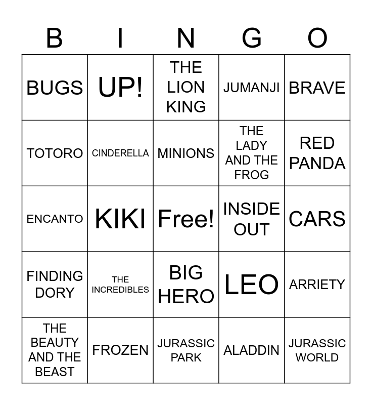 This bingo card has a free space and 34 words: MOANA, ALADDIN, COCO, FINDING NEMO, FINDING DORY, CINDERELLA, BRAVE, THE BEAUTY AND THE BEAST, UP!, MONSTERS INC., MINIONS, THE LION KING, TARZAN, MULAN, INSIDE OUT, RED PANDA, FROZEN, ENCANTO, THE INCREDIBLES, LEO, BIG HERO, MY FAVORITE VILLAIN, BUGS, CARS, JURASSIC PARK, JURASSIC WORLD, JUMANJI, ALICE IN WONDERLAND, THE LADY AND THE FROG, TOTORO, CHIHIRO, KIKI, ARRIETY and BIG FISH AND BEGONIA.