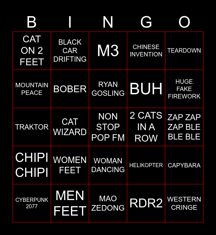 This bingo card has a free space and 24 words: WOMEN FEET, MEN FEET, RYAN GOSLING, CYBERPUNK 2077, TEARDOWN, CAT ON 2 FEET, MOUNTAIN PEACE, BLACK CAR DRIFTING, 2 CATS IN A ROW, WOMAN DANCING, BUH, TRAKTOR, HELIKOPTER, CAPYBARA, BOBER, RDR2, ZAP ZAP ZAP BLE BLE BLE, M3, HUGE FAKE FIREWORK, CAT WIZARD, WESTERN CRINGE, CHIPI CHIPI, CHINESE INVENTION and MAO ZEDONG.