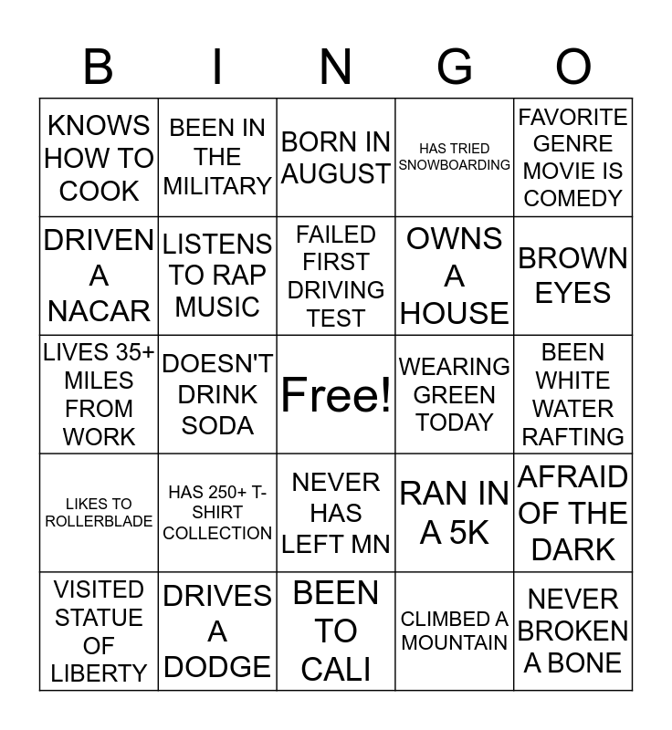 This bingo card has a free space and 24 words: HAS 250+ T-SHIRT COLLECTION, DRIVES A DODGE, FAILED FIRST DRIVING TEST, VISITED STATUE OF LIBERTY, FAVORITE GENRE MOVIE IS COMEDY, KNOWS HOW TO COOK, DRIVEN A NACAR, BEEN IN THE MILITARY, WEARING GREEN TODAY, NEVER HAS LEFT MN, OWNS A HOUSE, LIVES 35+ MILES FROM WORK, RAN IN A 5K, AFRAID OF THE DARK, LISTENS TO RAP MUSIC, CLIMBED A MOUNTAIN, BEEN WHITE WATER RAFTING, BORN IN AUGUST, BROWN EYES, DOESN'T DRINK SODA, NEVER BROKEN A BONE, LIKES TO ROLLERBLADE, HAS TRIED SNOWBOARDING and BEEN TO CALI.