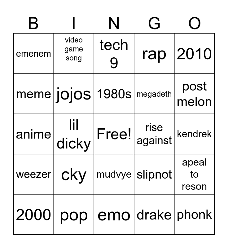 This bingo card has a free space and 24 words: cky, pop, 1980s, 2000, 2010, emenem, meme, video game song, rise against, mudvye, megadeth, anime, slipnot, apeal to reson, jojos, drake, kendrek, tech 9, post melon, lil dicky, phonk, weezer, rap and emo.