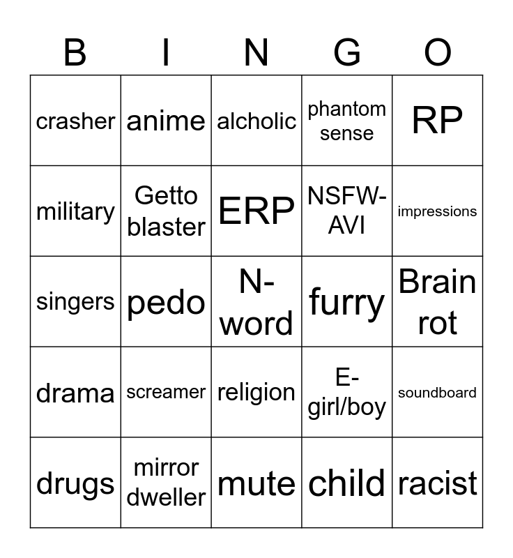 This bingo card has a free space and 24 words: screamer, mirror dweller, ERP, drugs, RP, crasher, military, anime, furry, religion, NSFW-AVI, singers, E-girl/boy, soundboard, Getto blaster, child, Brain rot, alcholic, impressions, pedo, racist, drama, phantom sense and mute.