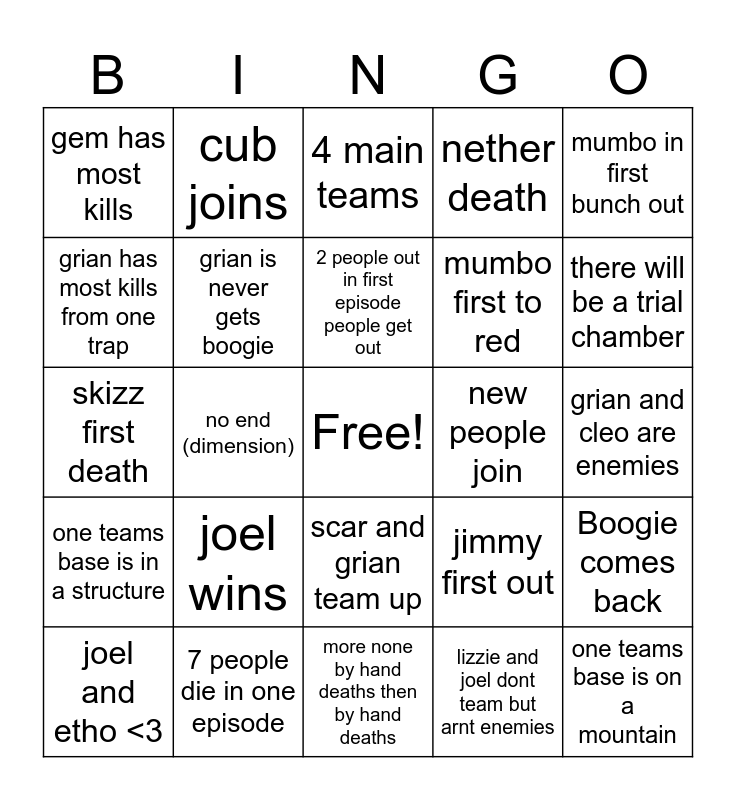 This bingo card has a free space and 24 words: joel wins, 7 people die in one episode, 2 people out in first episode people get out, joel and etho <3, mumbo in first bunch out, gem has most kills, grian has most kills from one trap, cub joins, new people join, scar and grian team up, mumbo first to red, skizz first death, jimmy first out, Boogie comes back, grian is never gets boogie, lizzie and joel dont team but arnt enemies, grian and cleo are enemies, 4 main teams, there will be a trial chamber, no end (dimension), one teams base is on a mountain, one teams base is in a structure, nether death and more none by hand deaths then by hand deaths.