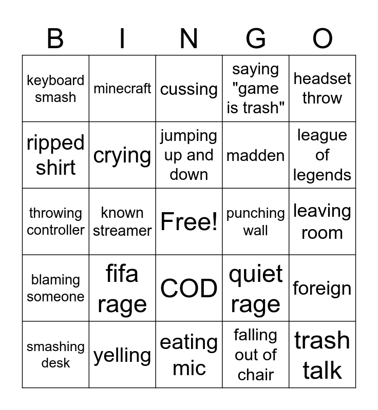 This bingo card has a free space and 24 words: fifa rage, yelling, jumping up and down, smashing desk, headset throw, keyboard smash, ripped shirt, minecraft, punching wall, COD, madden, throwing controller, quiet rage, foreign, crying, falling out of chair, leaving room, cussing, league of legends, known streamer, trash talk, blaming someone, saying "game is trash" and eating mic.