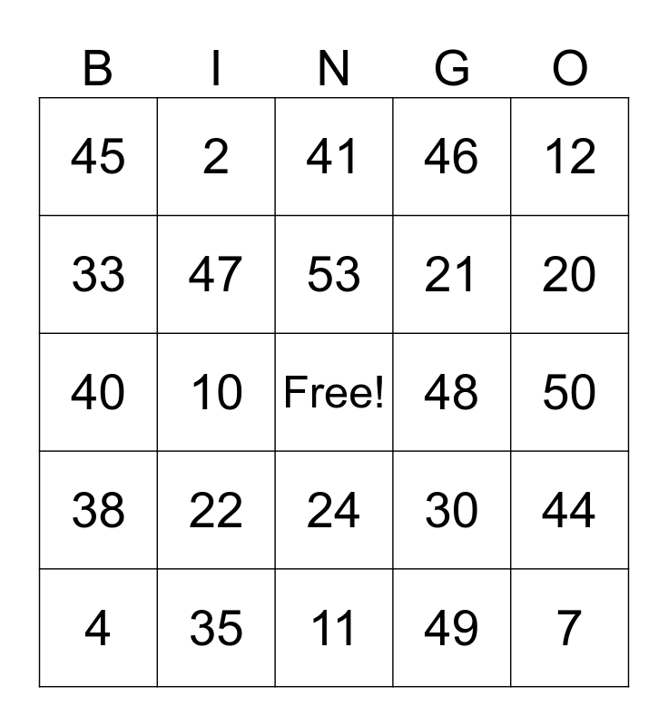This bingo card has a free space and 24 words: 22, 35, 53, 4, 12, 45, 33, 2, 48, 24, 21, 40, 30, 44, 47, 49, 50, 41, 20, 10, 7, 38, 46 and 11.