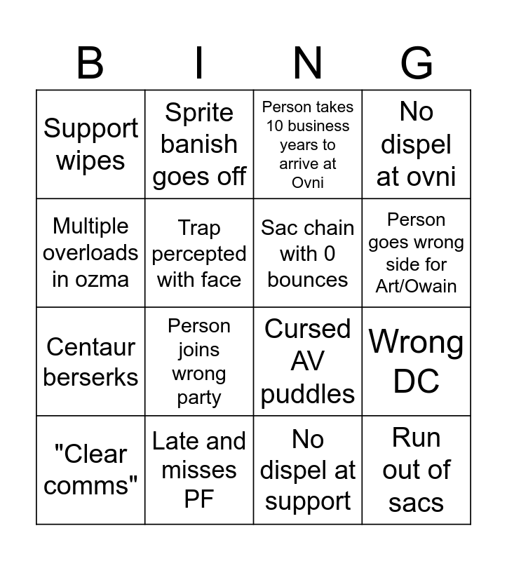 This bingo card has 16 words: Late and misses PF, Wrong DC, Person takes 10 business years to arrive at Ovni, Support wipes, Centaur berserks, Sprite banish goes off, Cursed AV puddles, No dispel at support, Multiple overloads in ozma, Trap percepted with face, "Clear comms", No dispel at ovni, Person joins wrong party, Person goes wrong side for Art/Owain, Sac chain with 0 bounces and Run out of sacs.