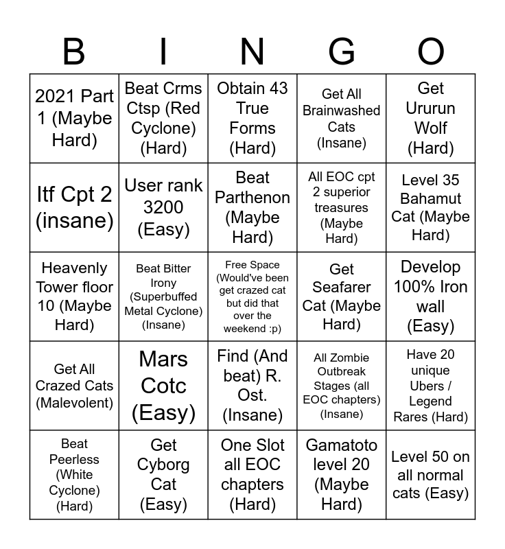This bingo card has a free space and 24 words: Mars Cotc (Easy), Get Cyborg Cat (Easy), Beat Parthenon (Maybe Hard), Beat Peerless (White Cyclone) (Hard), Get Ururun Wolf (Hard), 2021 Part 1 (Maybe Hard), Itf Cpt 2 (insane), Beat Crms Ctsp (Red Cyclone) (Hard), Get Seafarer Cat (Maybe Hard), Find (And beat) R. Ost. (Insane), All EOC cpt 2 superior treasures (Maybe Hard), Heavenly Tower floor 10 (Maybe Hard), All Zombie Outbreak Stages (all EOC chapters) (Insane), Have 20 unique Ubers / Legend Rares (Hard), User rank 3200 (Easy), Gamatoto level 20 (Maybe Hard), Develop 100% Iron wall (Easy), Obtain 43 True Forms (Hard), Level 35 Bahamut Cat (Maybe Hard), Beat Bitter Irony (Superbuffed Metal Cyclone) (Insane), Level 50 on all normal cats (Easy), Get All Crazed Cats (Malevolent), Get All Brainwashed Cats (Insane) and One Slot all EOC chapters (Hard).