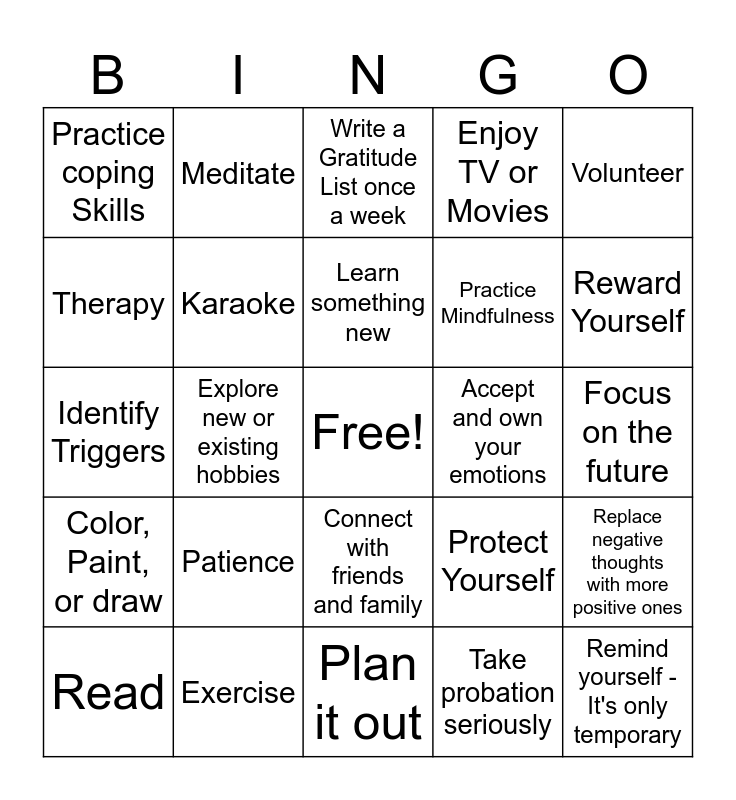 This bingo card has a free space and 24 words: Patience, Exercise, Learn something new, Read, Volunteer, Practice coping Skills, Therapy, Meditate, Accept and own your emotions, Connect with friends and family, Practice Mindfulness, Identify Triggers, Protect Yourself, Replace negative thoughts with more positive ones, Karaoke, Take probation seriously, Focus on the future, Write a Gratitude List once a week, Reward Yourself, Explore new or existing hobbies, Remind yourself - It's only temporary, Color, Paint, or draw, Enjoy TV or Movies and Plan it out.