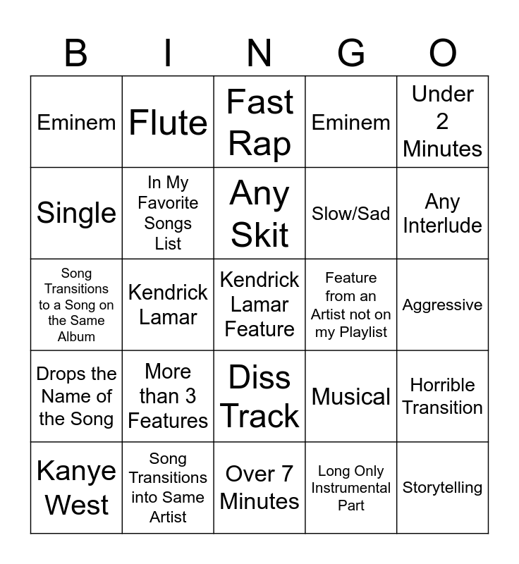 This bingo card has 25 words: More than 3 Features, Over 7 Minutes, Any Skit, Kanye West, Under 2 Minutes, Eminem, Single, Flute, Feature from an Artist not on my Playlist, Diss Track, Slow/Sad, Song Transitions to a Song on the Same Album, Musical, Horrible Transition, In My Favorite Songs List, Storytelling, Aggressive, Fast Rap, Any Interlude, Kendrick Lamar, Kendrick Lamar Feature, Song Transitions into Same Artist, Drops the Name of the Song, Eminem and Long Only Instrumental Part.