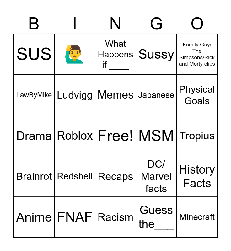 This bingo card has a free space and 24 words: Redshell, FNAF, Memes, Anime, Family Guy/ The Simpsons/Rick and Morty clips, SUS, LawByMike, 🙋♂️, MSM, Recaps, Japanese, Drama, DC/ Marvel facts, History Facts, Ludvigg, Guess the___, Tropius, What Happens if ____, Physical Goals, Roblox, Minecraft, Brainrot, Sussy and Racism.