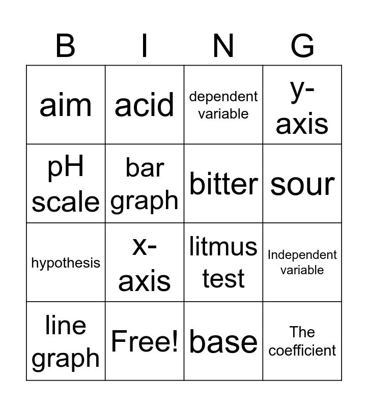 This bingo card has 16 words: Free!, Independent variable, dependent variable, aim, hypothesis, acid, litmus test, base, pH scale, bar graph, line graph, y-axis, x-axis, sour, bitter and The coefficient.