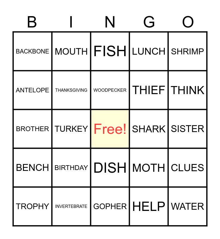 This bingo card has a free space and 24 words: BIRTHDAY, INVERTEBRATE, WOODPECKER, TROPHY, SHRIMP, BACKBONE, ANTELOPE, MOUTH, SHARK, DISH, THIEF, BROTHER, MOTH, CLUES, THANKSGIVING, HELP, SISTER, FISH, THINK, TURKEY, WATER, BENCH, LUNCH and GOPHER.