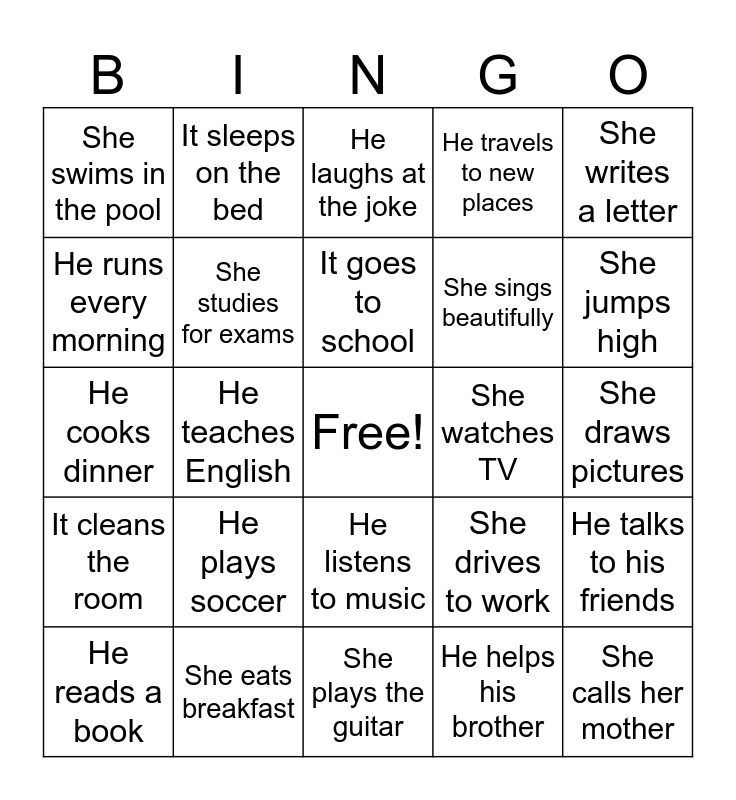 This bingo card has a free space and 24 words: He plays soccer, She eats breakfast, It goes to school, He reads a book, She writes a letter, She swims in the pool, He runs every morning, It sleeps on the bed, She watches TV, He listens to music, She sings beautifully, He cooks dinner, She drives to work, He talks to his friends, She studies for exams, He helps his brother, She draws pictures, He laughs at the joke, She jumps high, He teaches English, She calls her mother, It cleans the room, He travels to new places and She plays the guitar.